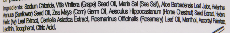 Skład oparty jest na naturalnych składnikach. Poza zwykłą solą i solą morską znajdziemy w peelingu olej z pestek winogron, sok z aloesu, olej słonecznikowy, olej kukurydziany, ekstrakt z kasztanowca, ekstrakt z bluszczu, ekstrakt z wąkrotki azjatyckiej, olej rozmarynowy, mentol, lecytynę i witaminę E.