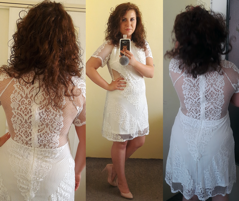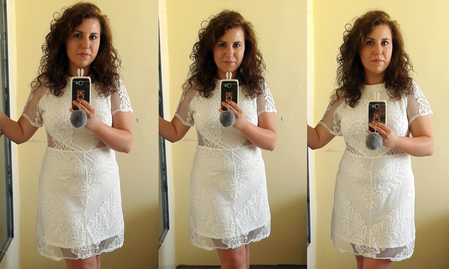 Kolejna, koronkowa sukienka  z prześwitami skradła mi serce do tego stopnia, że miałam dylemat, którą wybrać na poprawiny. Stwierdziłam jednak, że biała będzie idealna na wieczór panieński 🙂 Dziś zauważyłam, że w dość podobnej wystąpiła ostatnio Paulina Sykut. Nie śledzę ubrań gwiazd, ale akurat to jakoś przypadkowo mi się napatoczyło 🙂 Co prawda osobiście wolałabym, żeby była to jednak bardziej złamana biel, ale i tak czuję się w niej świetnie.