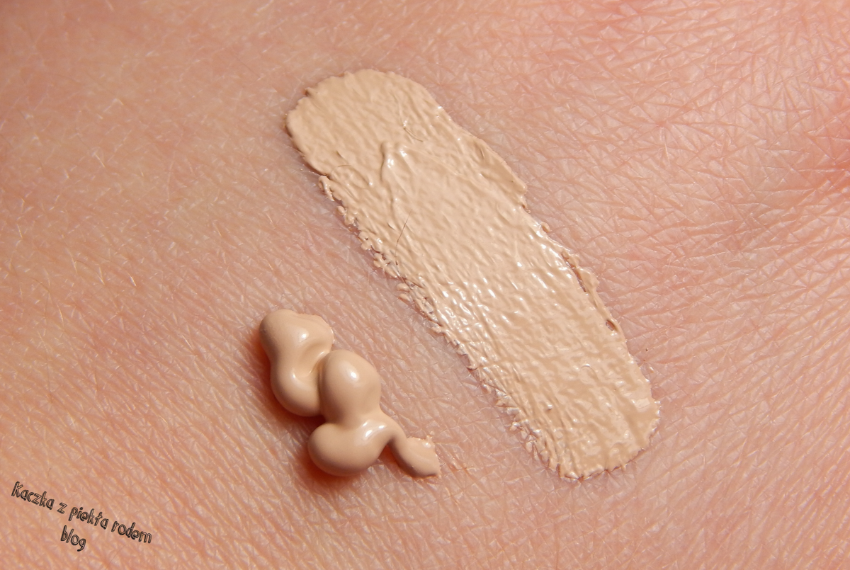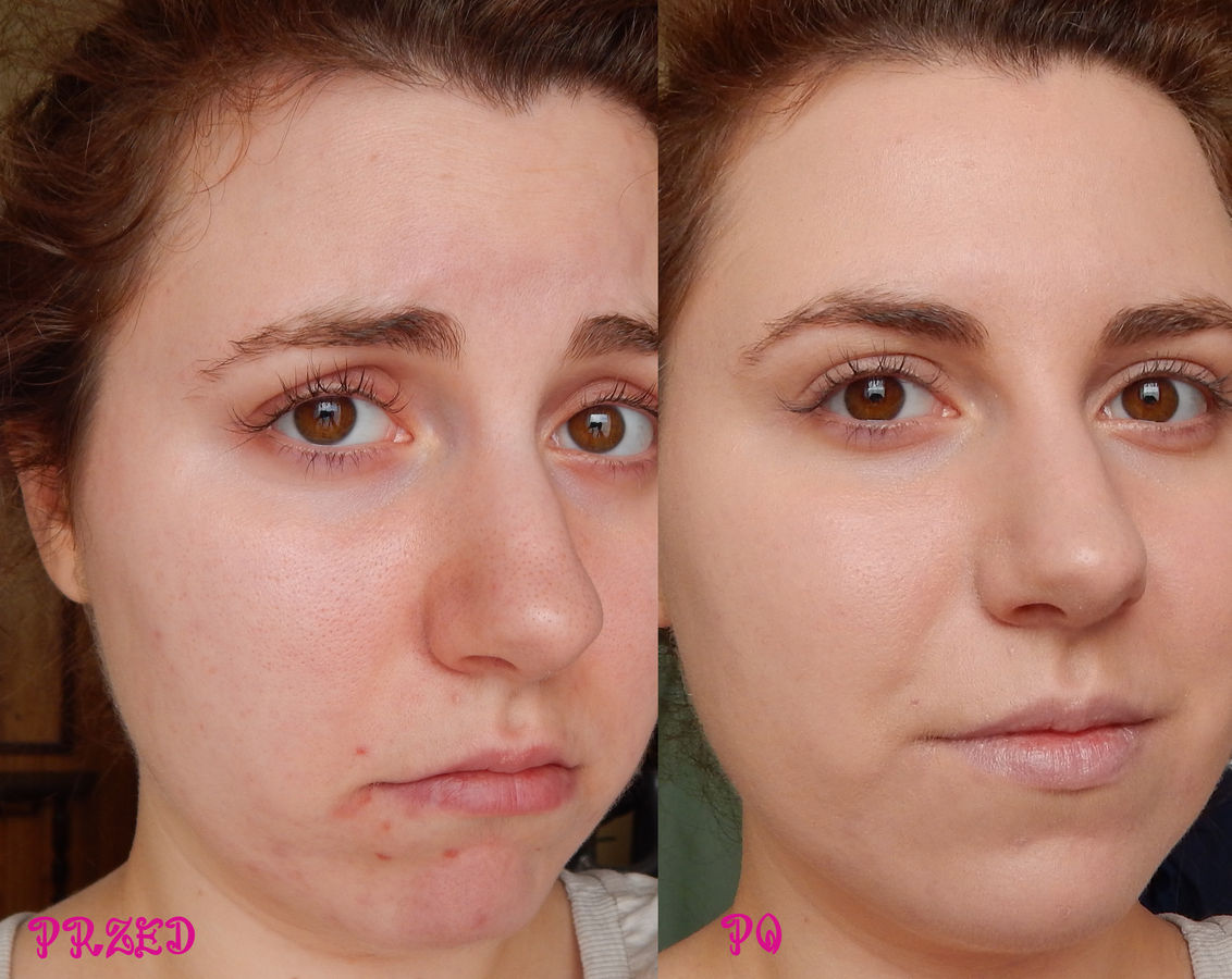 Myślę, że zdjęcia mówią same za siebie. Aż nie mogłam uwierzyć, że kosmetyk o tak delikatnej i lekkiej konsystencji może mieć takie właściwości kryjące! Pozwala ukryć nawet wyjątkowo oporne wypryski. Świetnie stapia się z cerą, pozostawia ją mięciutką i przyjemną w dotyku. Do utrwalania wystarcza mi odrobina pudru ryżowego, a makijaż trzyma się cały dzień.