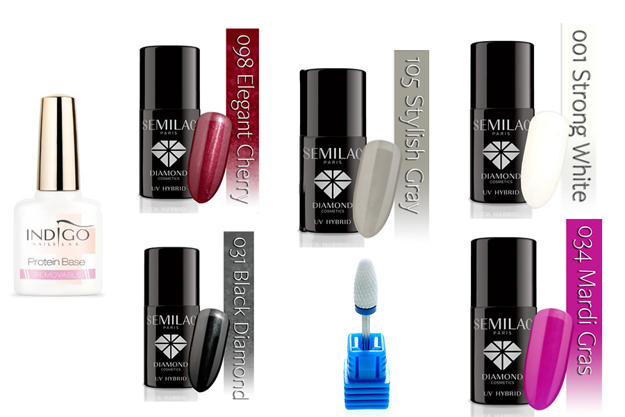 Semilac to dla mnie kopalnia cudownych kolorów. Tym razem potrzebuję czegoś klasycznego: 001 Strong White, 031 Black Diamond, 034 Mardi Gras, 105 Stylish Gray i 098 Elegant Cherry to moje zdecydowane typy gwiazdkowe.