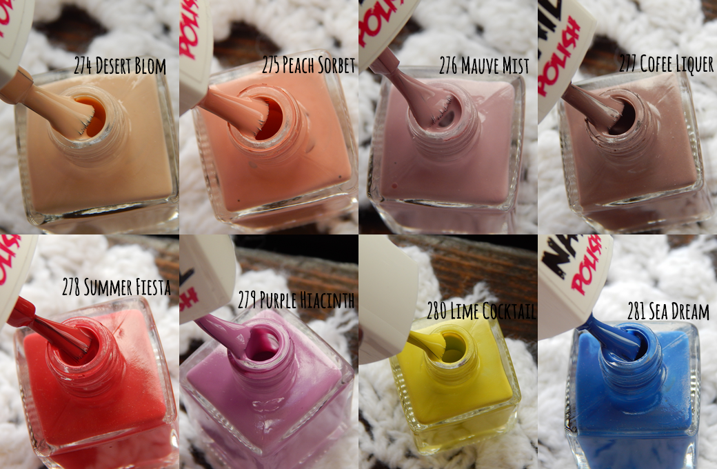 W skład kolekcji wchodzi 8 lakierów – 274 Desert Bloom, 275 Peach Sorbet, 276 Mauve Mist, 277 Coffee Liquer, 278 Summer Fiesta, 279 Purple Hiacinth i 280 Lime Cocktail.