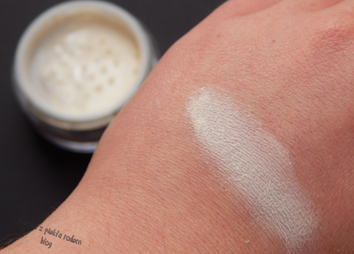 Puder ma waniliowy odcień, jest pylący i średnio zmielony.