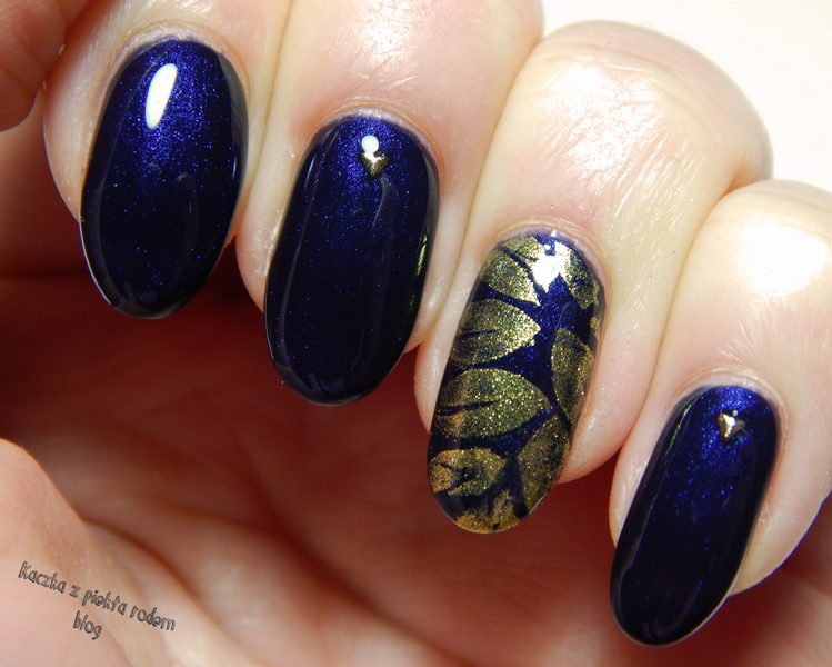 Na utwardzonej warstwie lakieru, przed nałożeniem topu, postanowiłam zrobić również stemple. Była to późna jesień więc złote listki wydały się być w sam raz. Okazało się jednak, ze wzór jest duży i mega trudno go odbić. Skorzystałam z płytki również pochodzącej z BPS BP-L008 KLIK oraz złotego lakieru do stempli KLIK. Lakier wygląda niczym płynne złoto, jest totalnie migoczący i prześliczny, ale na większych wzorach odbija się tragicznie z racji na swoją bardzo rzadką konsystencję. Mimo wszystko dałam radę.