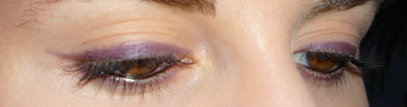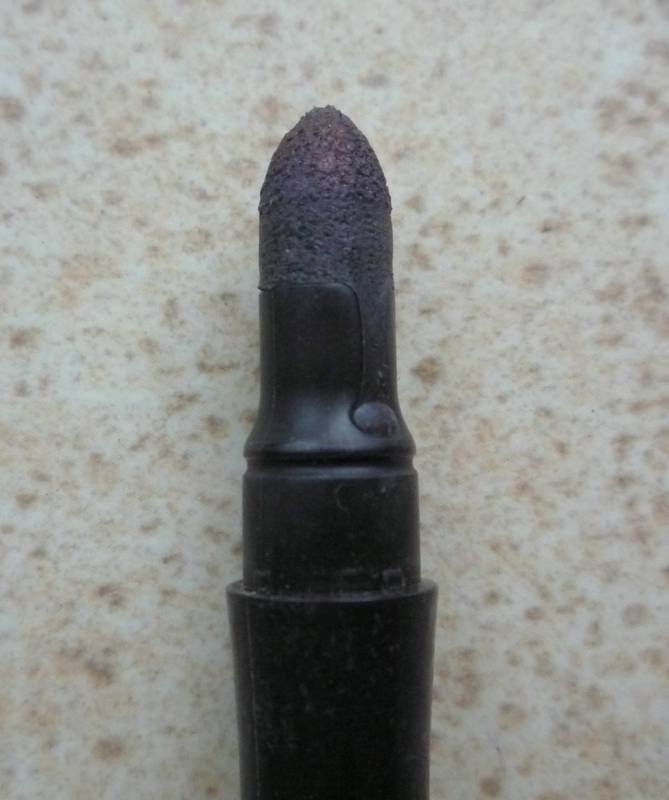 Według producenta jest to ” miękki ołówek z gąbeczką doskonałą do efektu smoky eyes „. Nic dodać nic ująć, chociaż może jednak trochę dodam. Ołówek faktycznie ma świetną konsystencję, jest miękki ale nie mazisty, wygodnie rysuje jednolitą linię na powiece. Kolor jest bardzo wyraźny – piękny, intensywny fiolet, nie zaś szarawo – siny. Spokojnie mogę zapewnić, że makijaż wykonany tym ołówkiem utrzyma się kilka godzin bez blaknięcia koloru czy odbijania się w załamaniu powieki. Łatwo poddaje się usuwaniu płynem do demakijażu, co dla mnie jest sporym plusem bo nie lubię znęcać się nad powiekami.